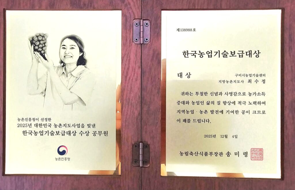 구미시농업기술센터 최수정 팀장이 농촌지도 분야 최고 권위의 상인 ‘2025 한국농업기술보급대상’ 대상을 수상한 것이다. 시상식은 12월 4일 농촌진흥청 종합연찬관에서 개최됐으며, 현장 농업인과 동료 공직자들의 축하 속에 따뜻한 감동을 남겼다.
