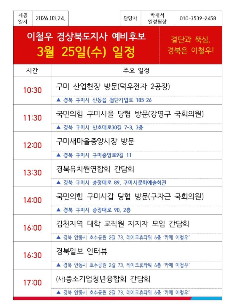 Home/TOP News/이철우 경북도지사 예비후보 3월25일 일정표 TOP News문화사회지역소식 이철우 경북도지사 예비후보 3월25일 일정표 Y저널뉴스 2026년 3월 24일 y저널뉴스 김수경(ymedia@kakao.com) 인기태그이철우도지사 일정 조지사후보