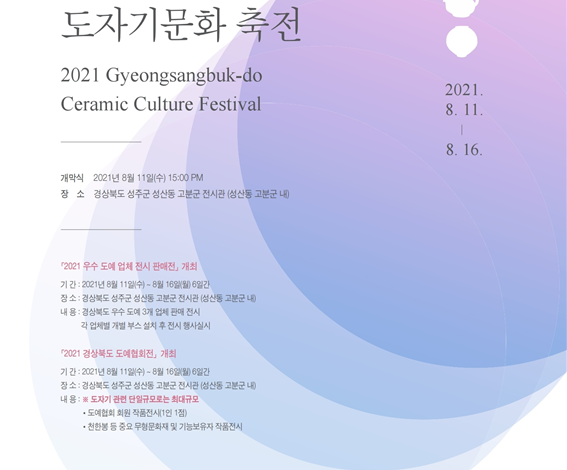 경상북도는 올해 12회째를 맞는‘경상북도 도자기 문화축전’이 성주 성산동 고분군 전시관에서 11일부터 16일까지 6일간 열린다고 밝혔다.