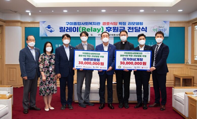 구미시(시장 장세용)는 9월 8일(수) 시청 국제통상협력실에서 장세용 구미시장, 대가야삼계탕 조중래 대표, 바른유병원 유영상 대표원장, 장세창 구미종합사회복지관장, 경북사회복지공동모금회 전우헌 회장이 참석한 가운데 『구미종합사회복지관 경로식당 확장 리모델링』후원금을 전달하는 행사를 가졌다.