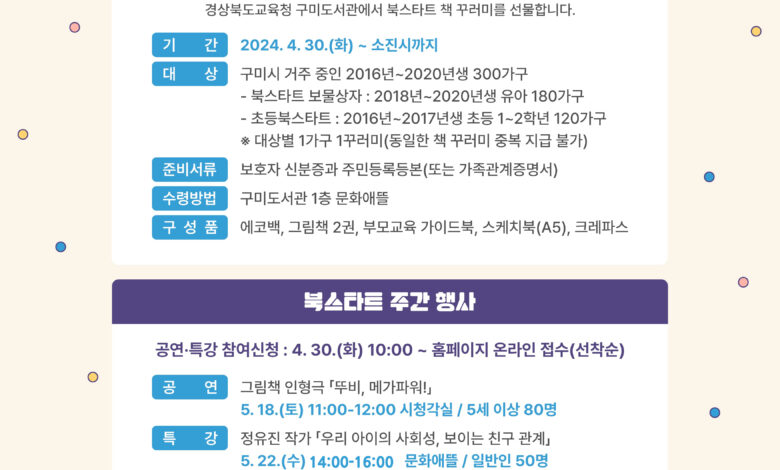 참가자에게 제공되는 책꾸러미는 △5~7세(2018~2020년생) 북스타트 보물상자, △8~9세(2016~2017년생) 초등 북스타트로 단계별 맞춤 그림책 2권과 부모님을 위한 가이드북, 기념품 2종, 가방으로 구성되며 구미도서관 문화애뜰에서 300가구에 선착순 무료로 배부한다.